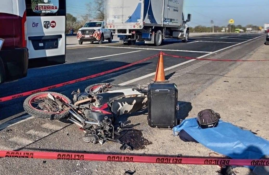 Un motociclista falleció tras impactarse contra una camioneta distribuidora de agua potable en la carretera Tampico-Mante, a la altura de la entrada al ejido Benito Juárez, en el municipio de Altamira.