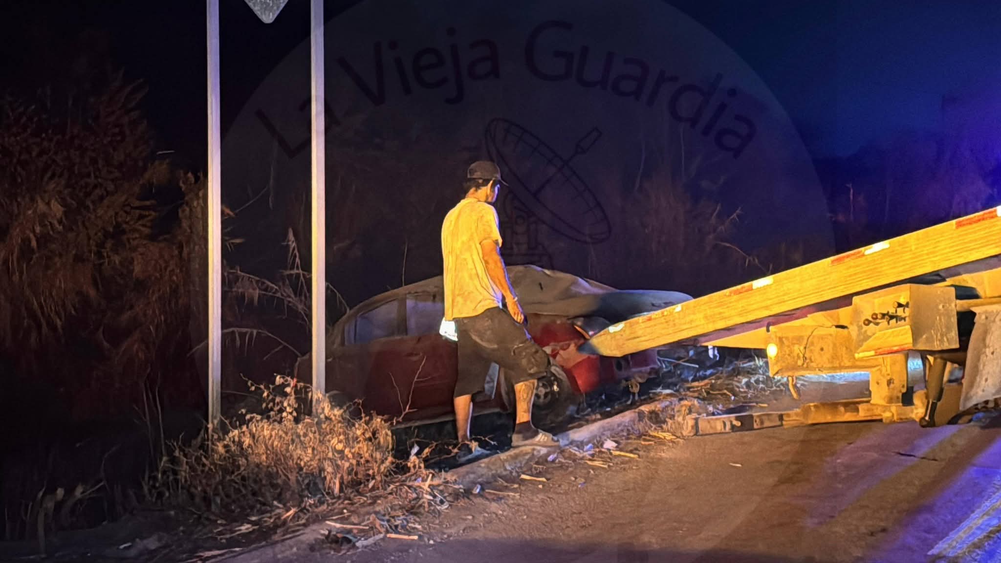 Un vehículo Nissan Sentra color guinda quedó completamente destrozado tras salirse de la carretera y volcar en la madrugada de este miércoles.