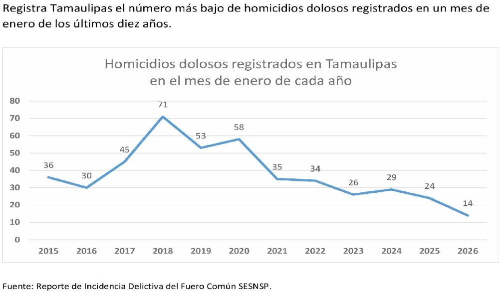 La estrategia de seguridad del gobierno de Américo Villarreal sigue dando resultados Ciudad Victoria, Tamaulipas. – En Tamaulipas se registraron 14 homicidiosdolosos en enero de 2026,...