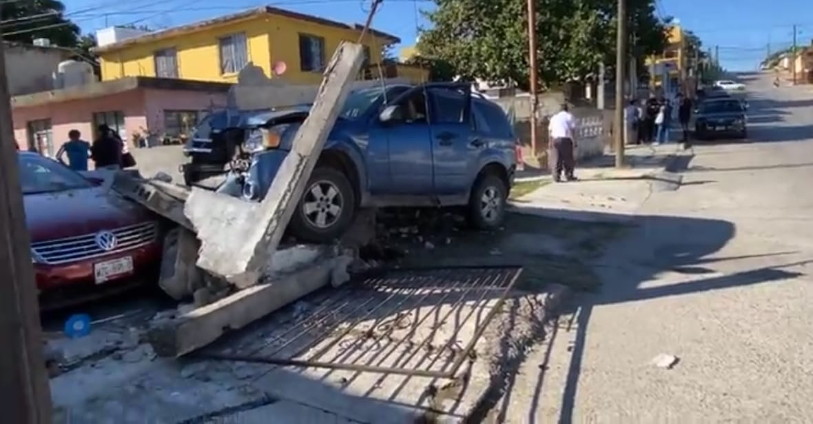 La unidad se impactó contra dos tramos de barda, un poste de concreto con mufa y medidor eléctrico, derribó un portón y provocó daños materiales a un Volkswagen rojo con placas de Tamaulipas que estaba estacionado.