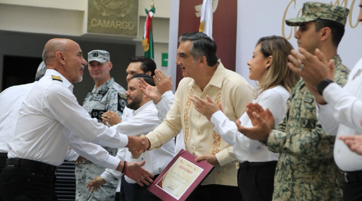 Tras la proyección de un video donde la directora de Protección Civil de Veracruz, Guadalupe Osorno, a nombre de la gobernadora Rocío Nahle da un reconocimiento al pueblo de Tamaulipas, por las labores de auxilio prestadas, el mandatario entregó litografías enviadas por la gobernadora al capitán Marcelo Israel Peña y al técnico auxiliar Fidel Eduardo Castro.